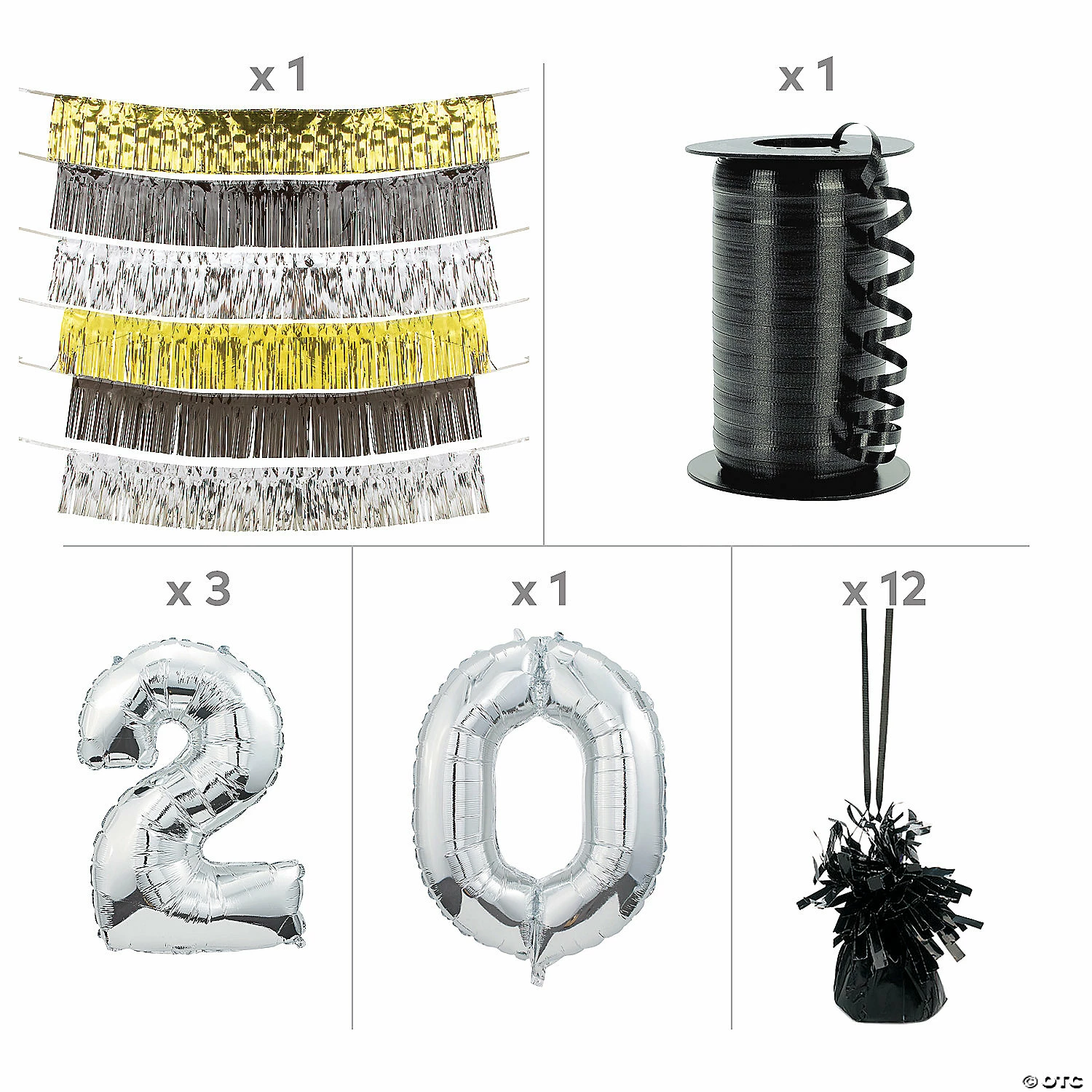 Impress guests at your New Yearâs Eve party or 2022 graduation celebration with this fun decorating kit! This kit makes it easy to create an impressive, shiny backdrop for any 2022 celebration. Great as a photo booth backdrop, this kit features â2022â spelled out in silver and gold mylar balloons and a dazzling foil fringe garland backdrop. (23 pcs. per unit) Assortment may vary. Simple assembly required. Š OTCIncludes:⢠3 Silver “2” Shaped Mylar Number Balloons (34″)⢠1 Silver “0” Shaped Number Mylar Balloon (34″)⢠12 Foil Black Metallic Balloon Weights (5 1/2″)⢠1 Polypropylene Black Curling Ribbon (3/16″ x 500 yds.)⢠1 Foil Black, Gold & SIlver Fringe Garland Backdrop (6 pcs. per set. 61″ x 10″)
