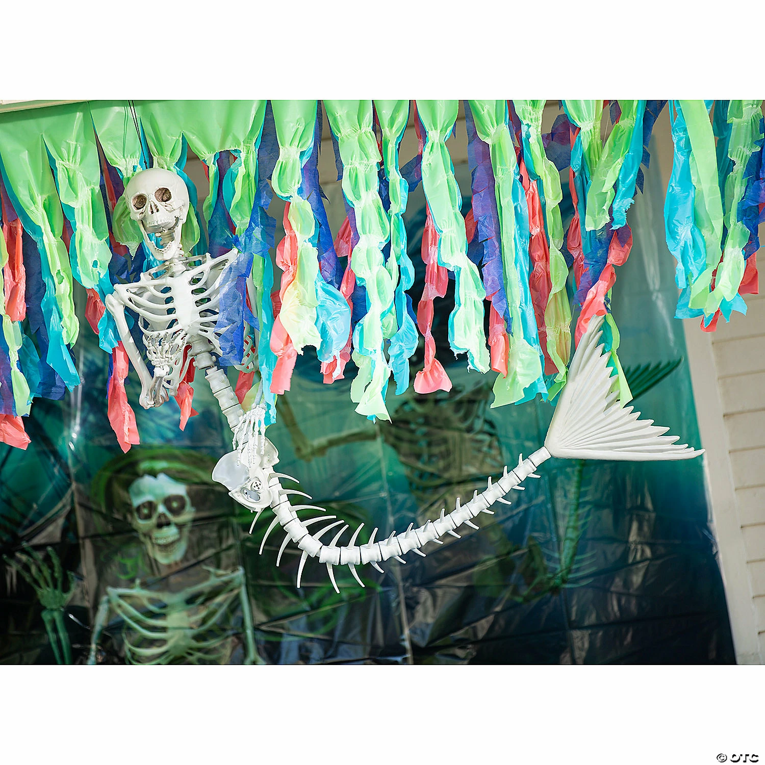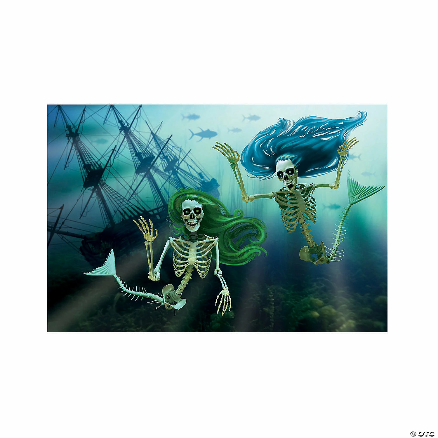 Everyone knows the Dead Sea is full of salt, but what lies beneath its surface? Dare to see for yourself! Featuring two bony ghoul-friends and a sunken pirate ship, this backdrop banner will make a splash when added to Halloween décor. Use it to transform a wall or create a DIY photo booth backdrop in a snap. These mermaid skeletons would love a picture with your guests. But, if you don’t want to end up like the pirates who came before, just be sure to plug your ears if they start to sing their siren song! Plastic. (3 pcs. per set) Assembled, 9 ft. x 6 ft. Simple assembly required. © OTC