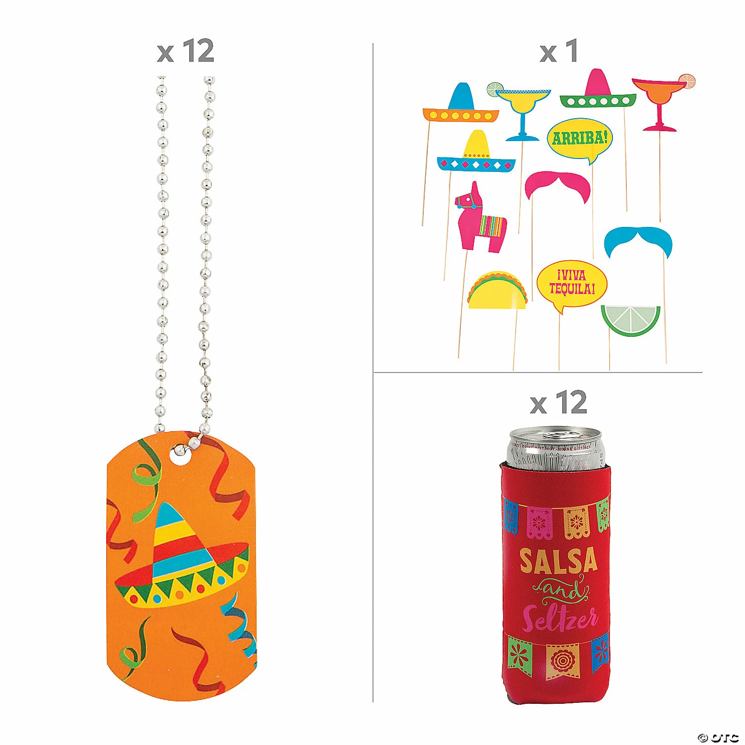 • 12-pc. Cardstock Fiesta Party Photo Stick Props (5 1/2″ – 8″ x 3″ – 7″ props on 14″ wooden sticks.)