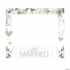 Get ready for some fun wedding photos with this attractive photo booth frame. Featuring a lovely greenery border with heart shapes and a “Just Married” message, this frame is designed to hold up and peer through for photos. Great for wedding reception photos or for social media posts after an elopement, this frame is a fun choice for taking photos! Cardboard. 35″ x 30″ © OTC