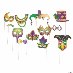 Smile and say “Fat Tuesday!” These Mardi Gras Stick Costume Props will make your Mardi Gras party unforgettable. Literally. People will be taking selfies and posting pictures of your party to their pages all night long. Includes masquerade masks, hats, glasses, facial hair and accessories for your holiday photo booth. Cardstock with wooden sticks. 4 3/4″ – 9″ x 1 1/2″ – 9″ © OTC