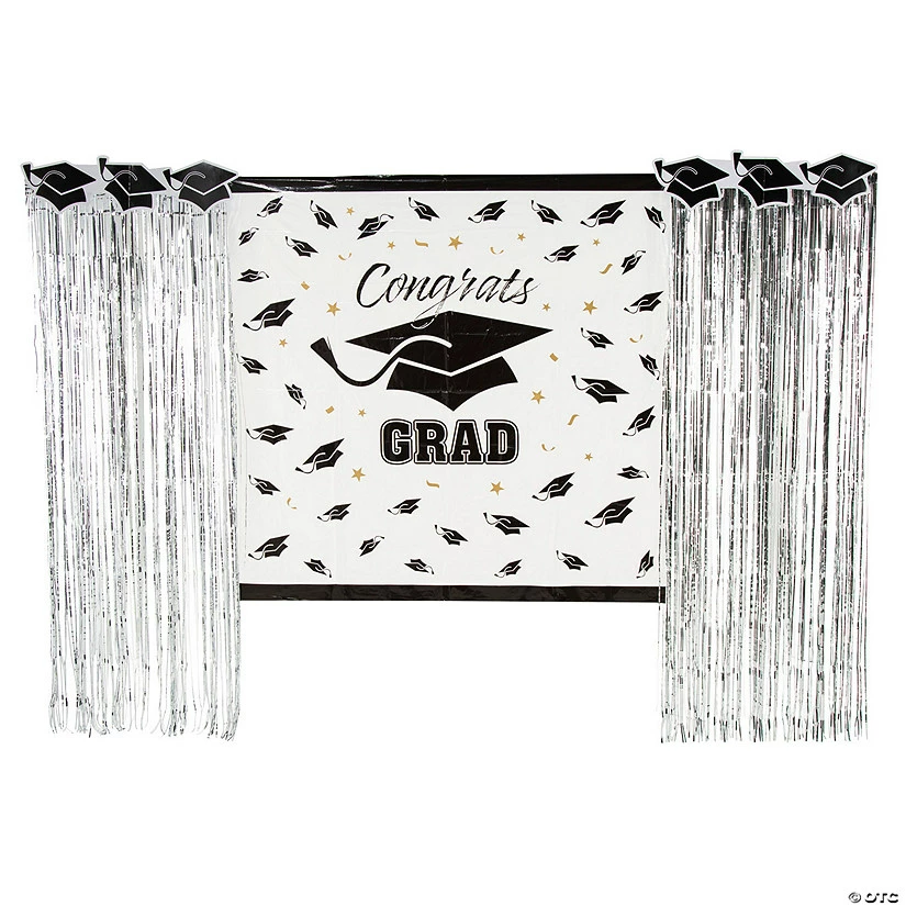 Make sure everyone gets a great photo with the grinning graduate in front of this amazing photo booth set! Add this kit to your graduation party supplies and set it up near the gift table or the spot where the graduate is holding court. Check out more grad party supplies and decorations elsewhere on this site. (5 pcs. per unit) Simple assembly required. Assortment may vary. © OTCIncludes:• 1 Plastic Backdrop (6 ft. x 6 ft.) • 2 Foil Door Curtains (36″ x 78″) • 2 Cardstock Cutouts (36″ x 11″)